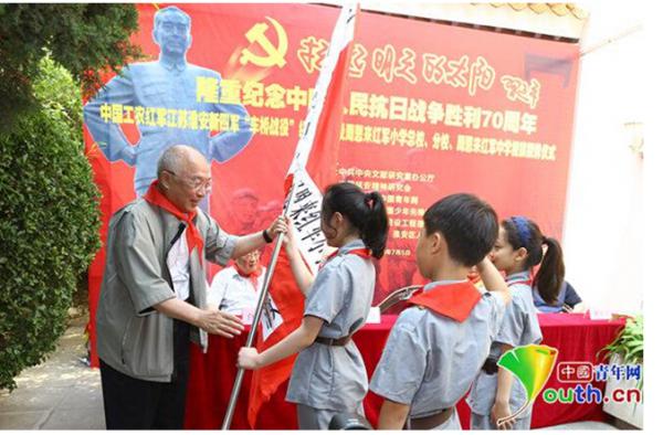 财政部原部长项怀诚为“中国工农红军周恩来红军小学总校”授旗。中国青年网记者 张炎良 摄