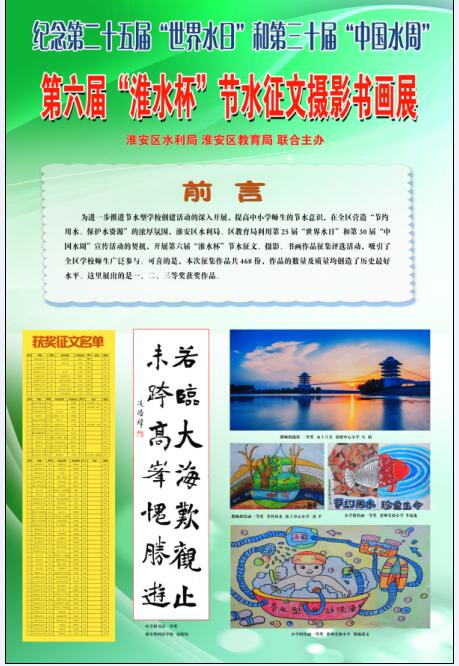 日前,淮安区第六届“淮水杯”节水征文、书法、绘画、摄影作品征集评选活动圆满结束。各学校积极组织师生参加竞赛活动。活动共征集参赛作品468份。经评审,最终共评出优秀作品231份,其中征文62篇,书法72幅,绘画75幅,摄影22幅,优秀组织奖6个。